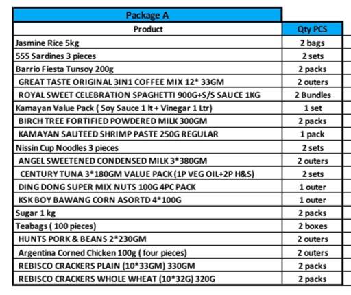 Also included in the package, according to a list of contents obtained, were three pieces of of canned sardines, three-in-one coffee sachets, a value pack containing one-liter bottles of soy sauce and vinegar, powdered milk, three cup noodles, condensed milk, a kilo of sugar, canned pork and beans, corned chicken and crackers.
