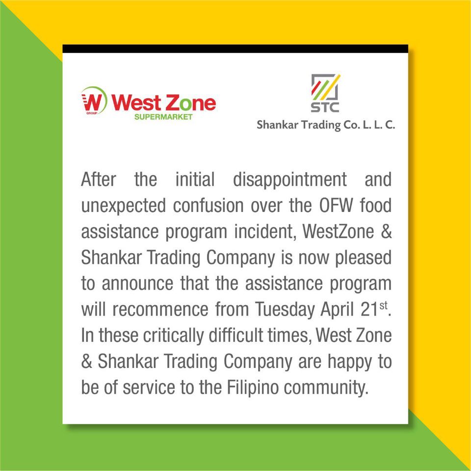 West Zone, a popular go-to place in the community because of its extensive Philippine products, has resumed its food drive with the Overseas Workers Welfare Administration (OWWA) for overseas Filipino workers (OFWs) who have applied for the relief.