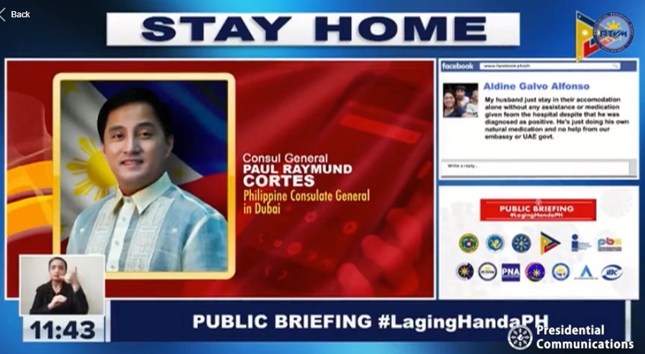 Cortes said they have been receiving calls from OFWs seeking help after finding out they have COVID-19. The consulate coordinates these cases with Dubai Police and Dubai Health Authorities.