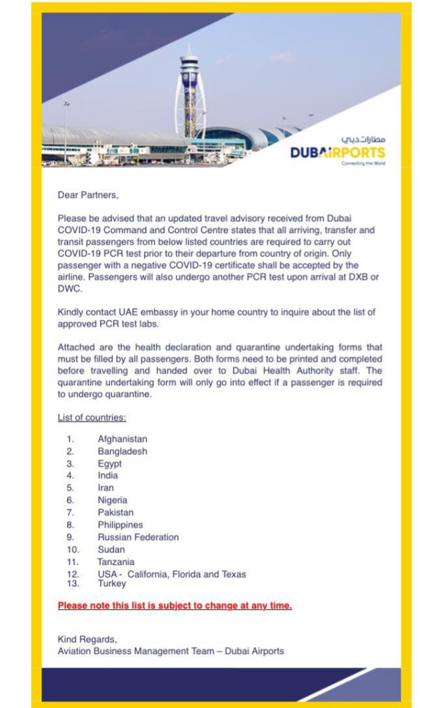 “Please be advised that an updated travel advisory received from Dubai COVID-19 Command and Control Centre states that all arriving, transfer and transit passengers from the…listed countries are required to carry out COVID-19 test prior to their departure from the country of origin.
