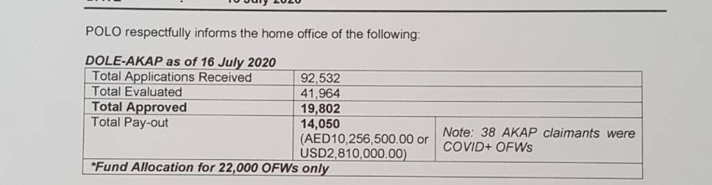 The AED16.60 million is good only for 22,000 qualified OFWs, according to POLO head, Labor Attaché Felicitas Bay. Labor Secretary Silvestre Bello III has said there were 400,000 documented OFWs in Dubai. There have been 92,532 AKAP applications, and counting.