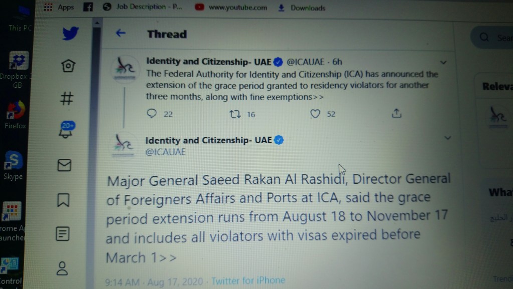 “The Federal Authority for Identity and Citizenship (ICA) has announced the extension of the grace period granted to residency violators for another three months, along with fine exemptions,” ICA, on Monday Aug 17, tweeted.