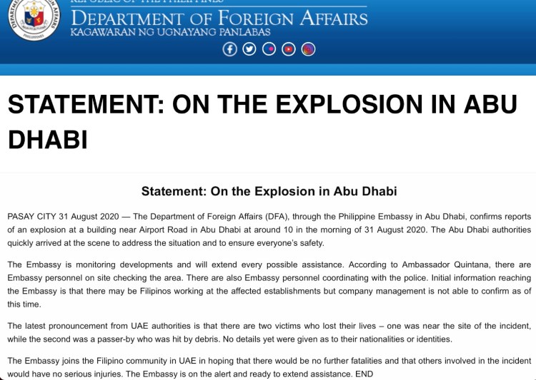 “The embassy joins the Filipino community in UAE in hoping that there would be no further fatalities and that others involved in the incident would have no serious injuries. The embassy is on the alert and ready to extend assistance,” the DFA statement read.