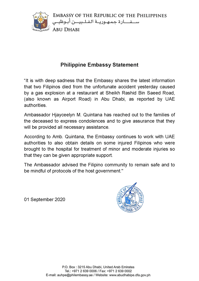 ABU DHABI, United Arab Emirates – The Philippine Embassy has confirmed that two Filipinos have died while some others were injured, in Monday morning’s restaurant blast here, saying in a statement that Ambassador Hjayceelyn Quintana “has reached out to the families of the deceased to express condolences and give assurance that they will be provided all necessary assistance.”