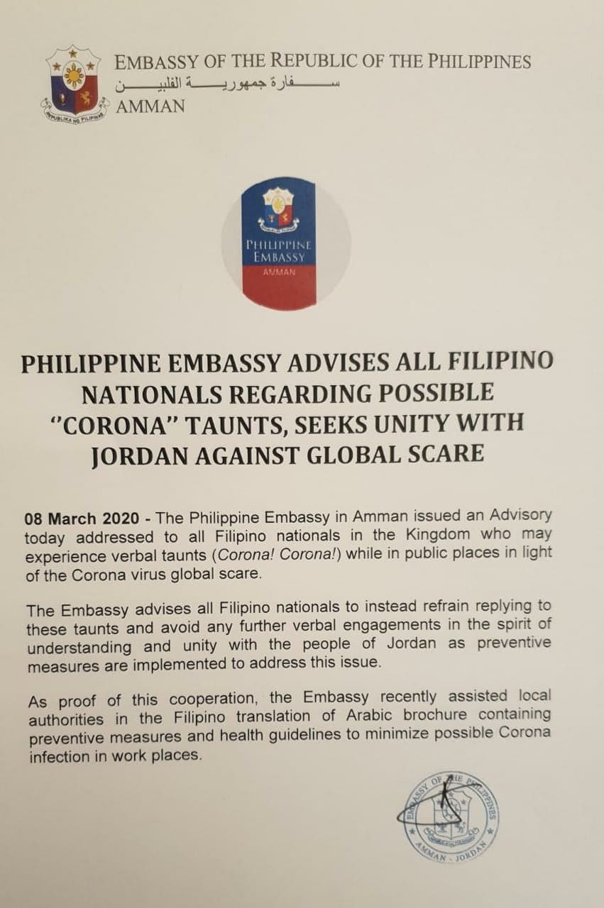 PH embassy in Jordan issues advisory about coronavirus verbal taunts